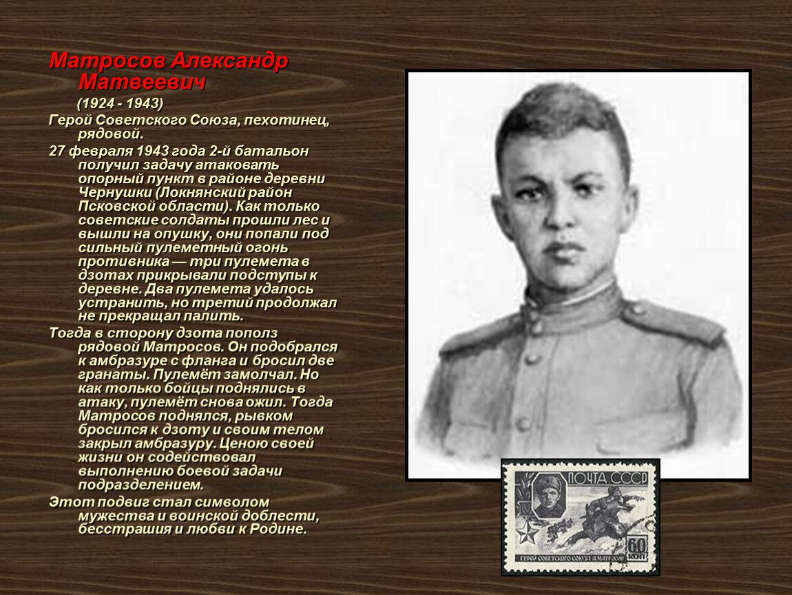 Тогда в сторону дзота пополз рядовой Матросов. Он подобрался к амбразуре с фланга и бросил две гранаты. Пулемёт замолчал. Но как только бойцы поднялись в атаку, пулемёт снова ожил. Тогда Матросов поднялся, рывком бросился к дзоту и своим телом закрыл амбразуру. Ценою своей жизни он содействовал выполнению боевой задачи подразделением.