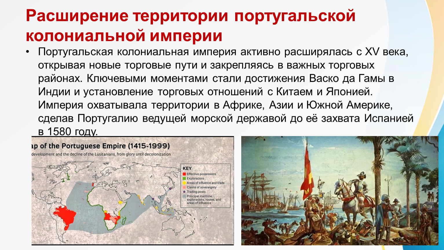 Португальская колониальная империя активно расширялась с XV века, открывая новые торговые пути и закрепляясь в важных торговых районах. Ключевыми моментами стали достижения Васко да Гамы в Индии и установление торговых отношений с Китаем и Японией. Империя охватывала территории в Африке, Азии и Южной Америке, сделав Португалию ведущей морской державой до её захвата Испанией в 1580 году.