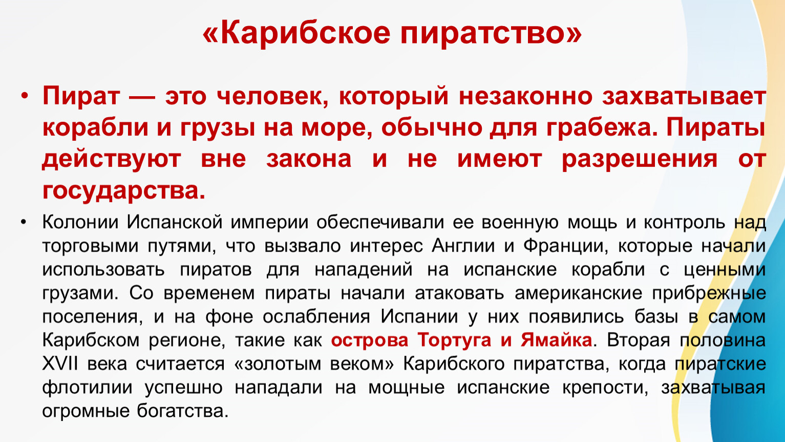 Пират — это человек, который незаконно захватывает корабли и грузы на море, обычно для грабежа. Пираты действуют вне закона и не имеют разрешения от государства.