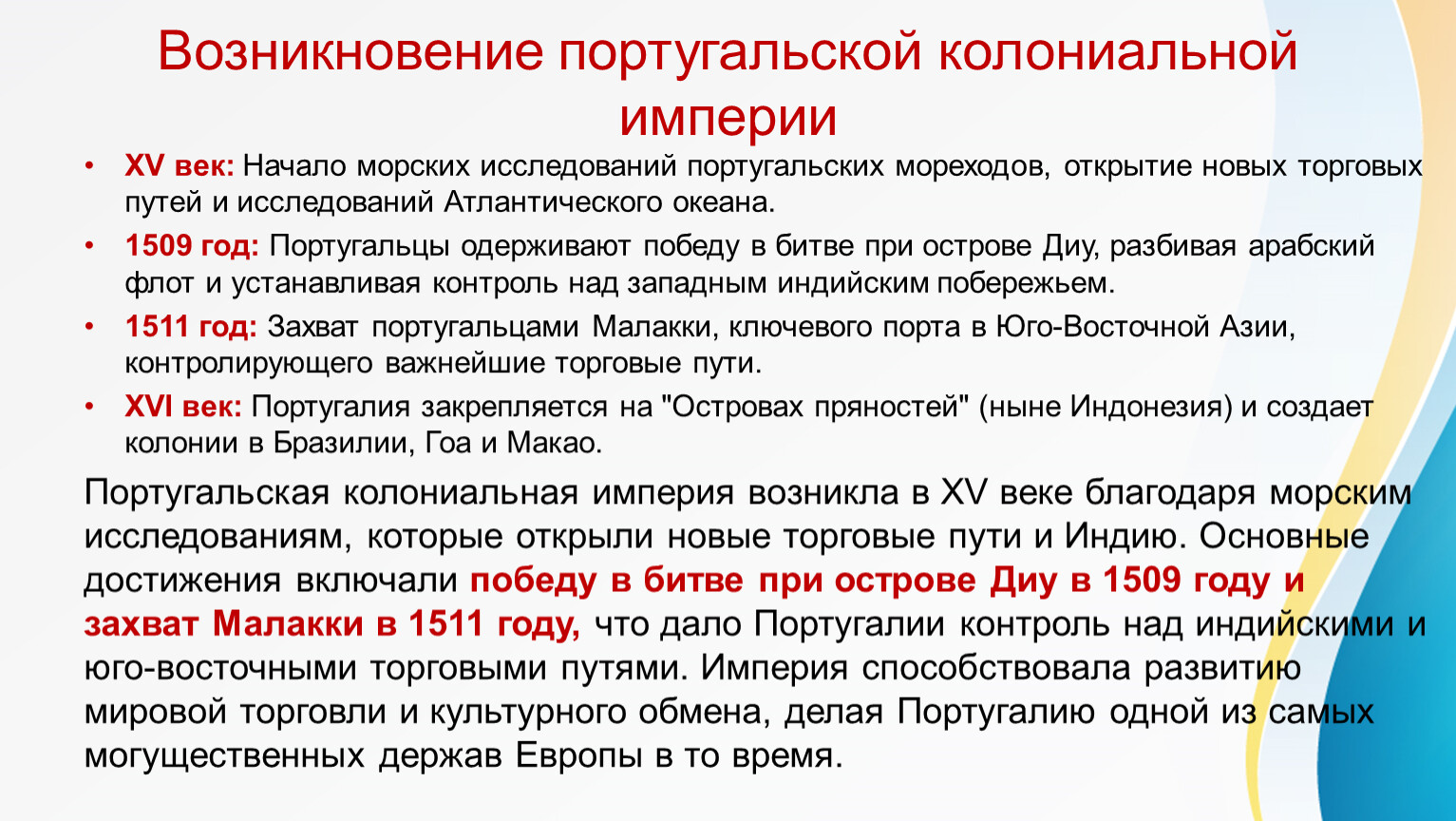 Португальская колониальная империя возникла в XV веке благодаря морским исследованиям, которые открыли новые торговые пути и Индию. Основные достижения включали победу в битве при острове Диу в 1509 году и захват Малакки в 1511 году, что дало Португалии контроль над индийскими и юго-восточными торговыми путями. Империя способствовала развитию мировой торговли и культурного обмена, делая Португалию одной из самых могущественных держав Европы в то время.