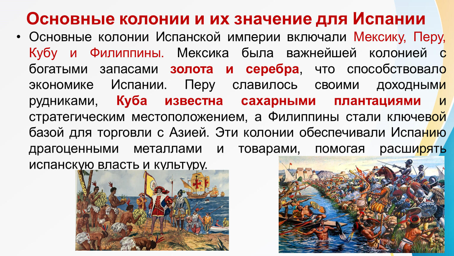 Основные колонии и их значение для Испании