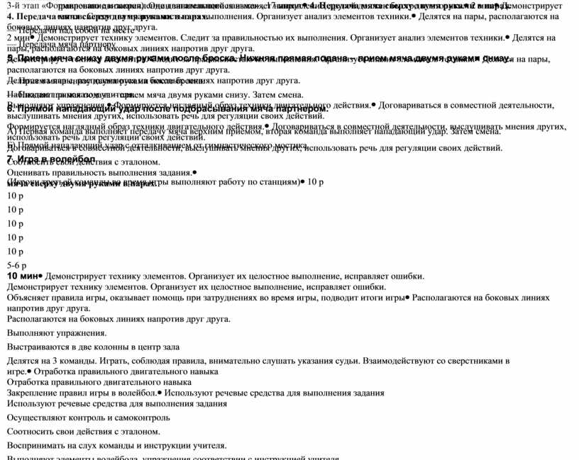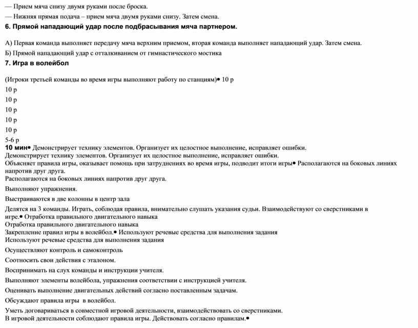 — иметь углубленные представления о технике выполнения передачи мяча сверху двумя руками, приема мяча снизу двумя руками, нижней прямой подачи, прямого нападающего удара;