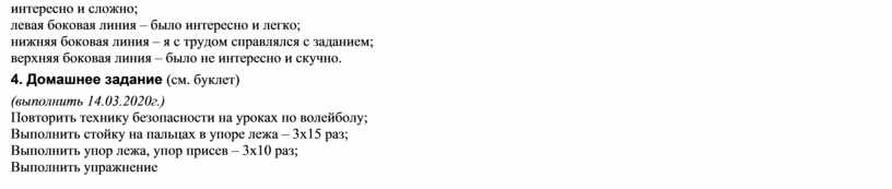 1. Построение, подведение итогов урока. 2. Оценка работы на уроке: — Предлагаю вам оценить свою работу сегодня на уроке и поставить себе оценки, после чего я проставлю вам оценки. 3. Рефлексия «Волейболисты»: — Итак, ребята у вас в руках «волейбольные мячи». Посмотрите внимательно на волейбольную площадку и поместите мяч в ту часть площадки, которая, по вашему мнению, соответствует сегодняшнему урока. § правая лицевая линия – было интересно и сложно; § левая боковая линия – было интересно и легко; § нижняя боковая линия – я с трудом справлялся с заданием; § верхняя боковая линия – было не интересно и скучно. 4. Домашнее задание (см. буклет) (выполнить 14.03.2020г.) 1. Повторить технику безопасности на уроках по волейболу; 2. Выполнить стойку на пальцах в упоре лежа – 3х15 раз; 3. Выполнить упор лежа, упор присев – 3х10 раз; 4. Выполнить упражнение «планка» — 2х30 сек. 5.Организованный выход класса из зала |