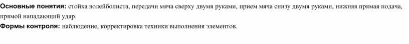 Основные понятия: стойка волейболиста, передачи мяча сверху двумя руками, прием мяча снизу двумя руками, нижняя прямая подача, прямой нападающий удар.