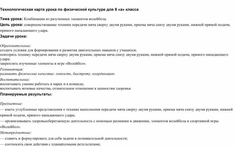 Технологическая карта урока по физической культуре для 8 «а» класса