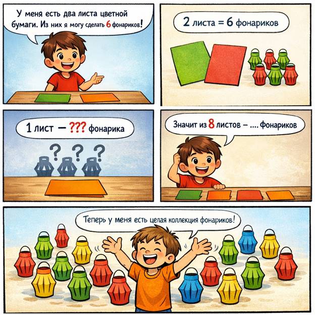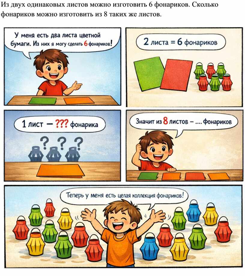 Из двух одинаковых листов можно изготовить 6 фонариков. Сколько фонариков можно изготовить из 8 таких же листов.