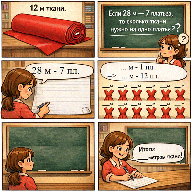 Из 28 метров ткани можно сшить 7 одинаковых платьев. Сколько потребуется ткани, чтобы сшить 12 таких латьев?