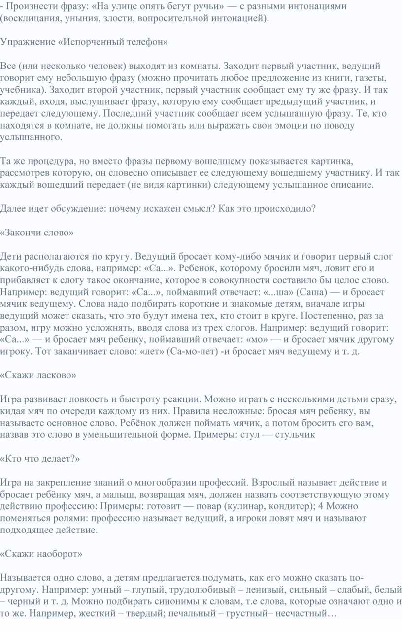 Все (или несколько человек) выходят из комнаты. Заходит первый участник, ведущий говорит ему небольшую фразу (можно прочитать любое предложение из книги, газеты, учебника). Заходит второй участник, первый участник сообщает ему ту же фразу. И так каждый, входя, выслушивает фразу, которую ему сообщает предыдущий участник, и передает следующему. Последний участник сообщает всем услышанную фразу. Те, кто находятся в комнате, не должны помогать или выражать свои эмоции по поводу услышанного.