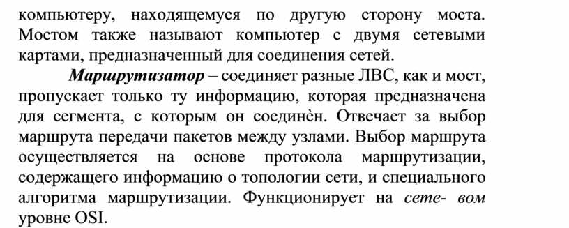Маршрутизатор – соединяет разные ЛВС, как и мост, пропускает только ту информацию, которая предназначена для сегмента, с которым он соединѐн. Отвечает за выбор маршрута передачи пакетов между узлами. Выбор маршрута осуществляется на основе протокола маршрутизации, содержащего информацию о топологии сети, и специального алгоритма маршрутизации. Функционирует на сете- вом уровне OSI.