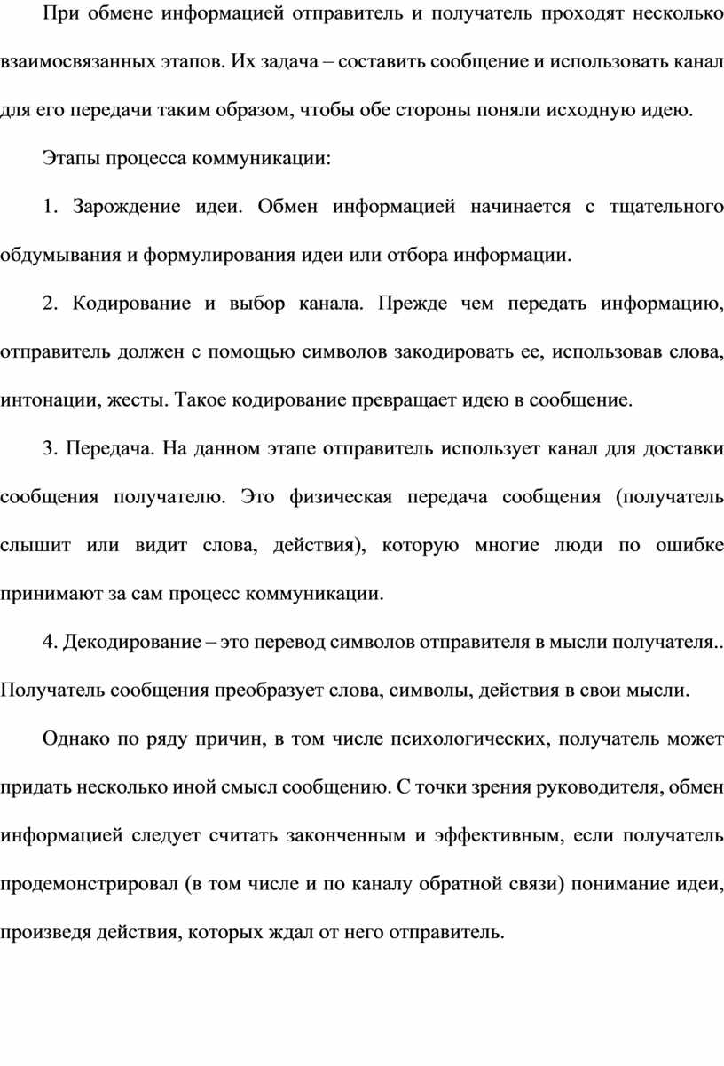 Однако по ряду причин, в том числе психологических, получатель может придать несколько иной смысл сообщению. С точки зрения руководителя, обмен информацией следует считать законченным и эффективным, если получатель продемонстрировал (в том числе и по каналу обратной связи) понимание идеи, произведя действия, которых ждал от него отправитель.