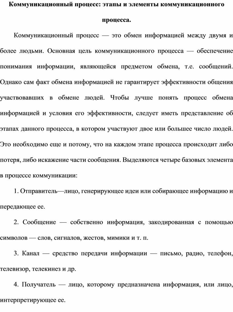 Коммуникационный процесс — это обмен информацией между двумя и более людьми. Основная цель коммуникационного процесса — обеспечение понимания информации, являющейся предметом обмена, т.е. сообщений. Однако сам факт обмена информацией не гарантирует эффективности общения участвовавших в обмене людей. Чтобы лучше понять процесс обмена информацией и условия его эффективности, следует иметь представление об этапах данного процесса, в котором участвуют двое или большее число людей. Это необходимо еще и потому, что на каждом этапе процесса происходит либо потеря, либо искажение части сообщения. Выделяются четыре базовых элемента в процессе коммуникации: