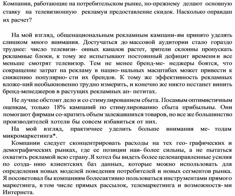Компании следует сконцентрировать расходы на тех гео графических и демографических рынках, где ее позиции наи более сильны, а не пытаться охватить рекламой всю страну. Я хотел бы видеть более целенаправленные усилия по созда нию клиентских баз данных, которые можно использовать для определения новых моделей поведения потребителей и новых сегментов рынка. Я посоветовал бы компаниям более активно пользоваться инструментами прямого маркетинга, в том числе прямых рассылок, телемаркетинга и возможностя ми Интернета.