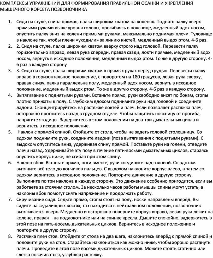 КОМПЛЕКСЫ УПРАЖНЕНИЙ ДЛЯ ФОРМИРОВАНИЯ ПРАВИЛЬНОЙ ОСАНКИ И УКРЕПЛЕНИЯ МЫШЕЧНОГО КОРСЕТА ПОЗВОНОЧНИКА
