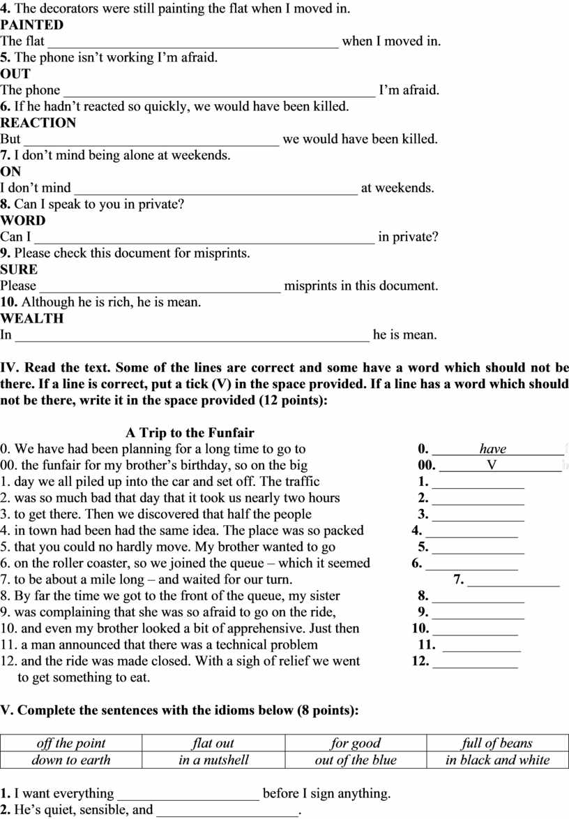 IV. Read the text. Some of the lines are correct and some have a word which should not be there. If a line is correct, put a tick (V) in the space provided. If a line has a word which should not be there, write it in the space provided (12 points):