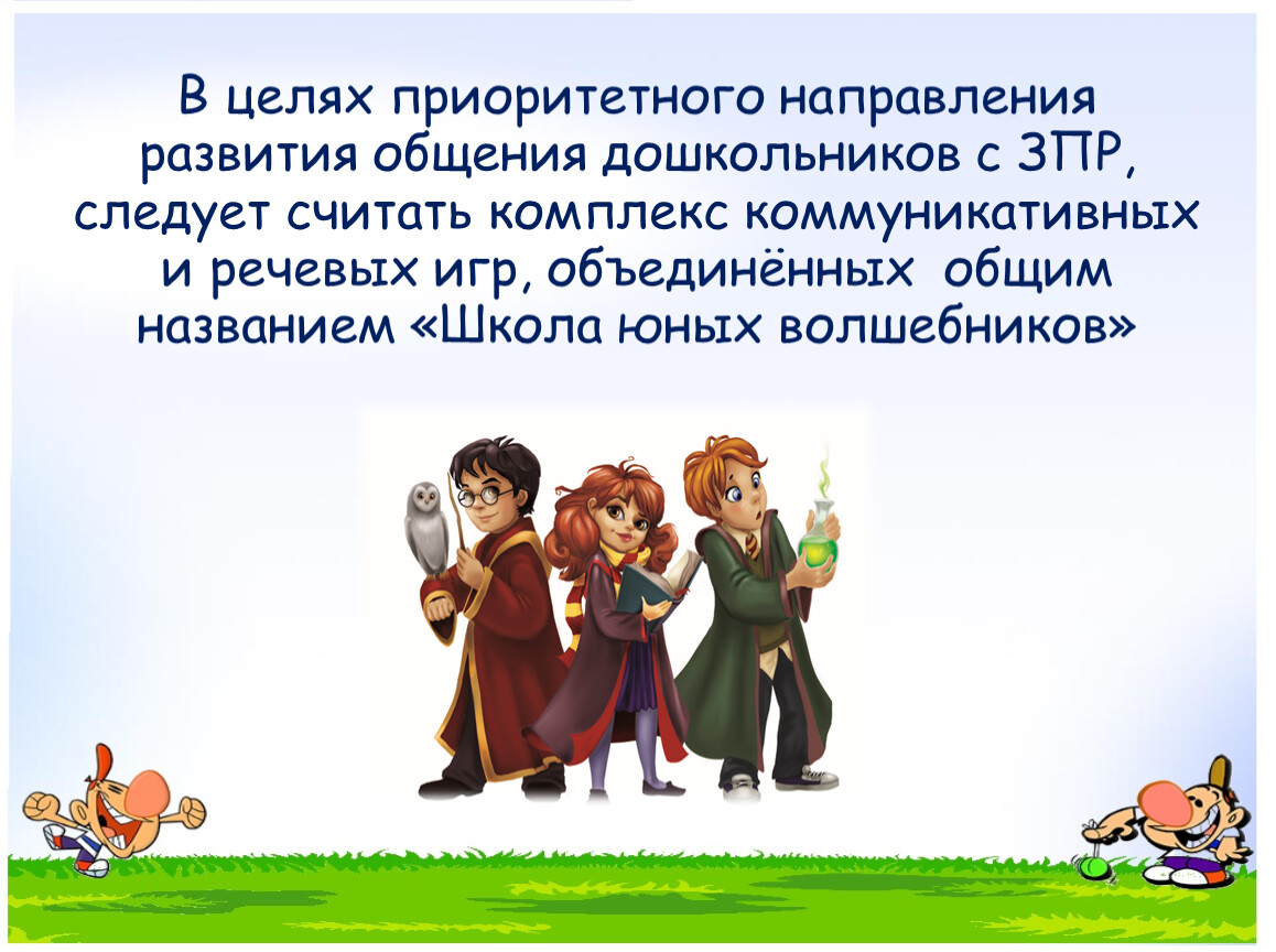 В целях приоритетного направления развития общения дошкольников с ЗПР, следует считать комплекс коммуникативных и речевых игр, объединённых общим названием «Школа юных волшебников»