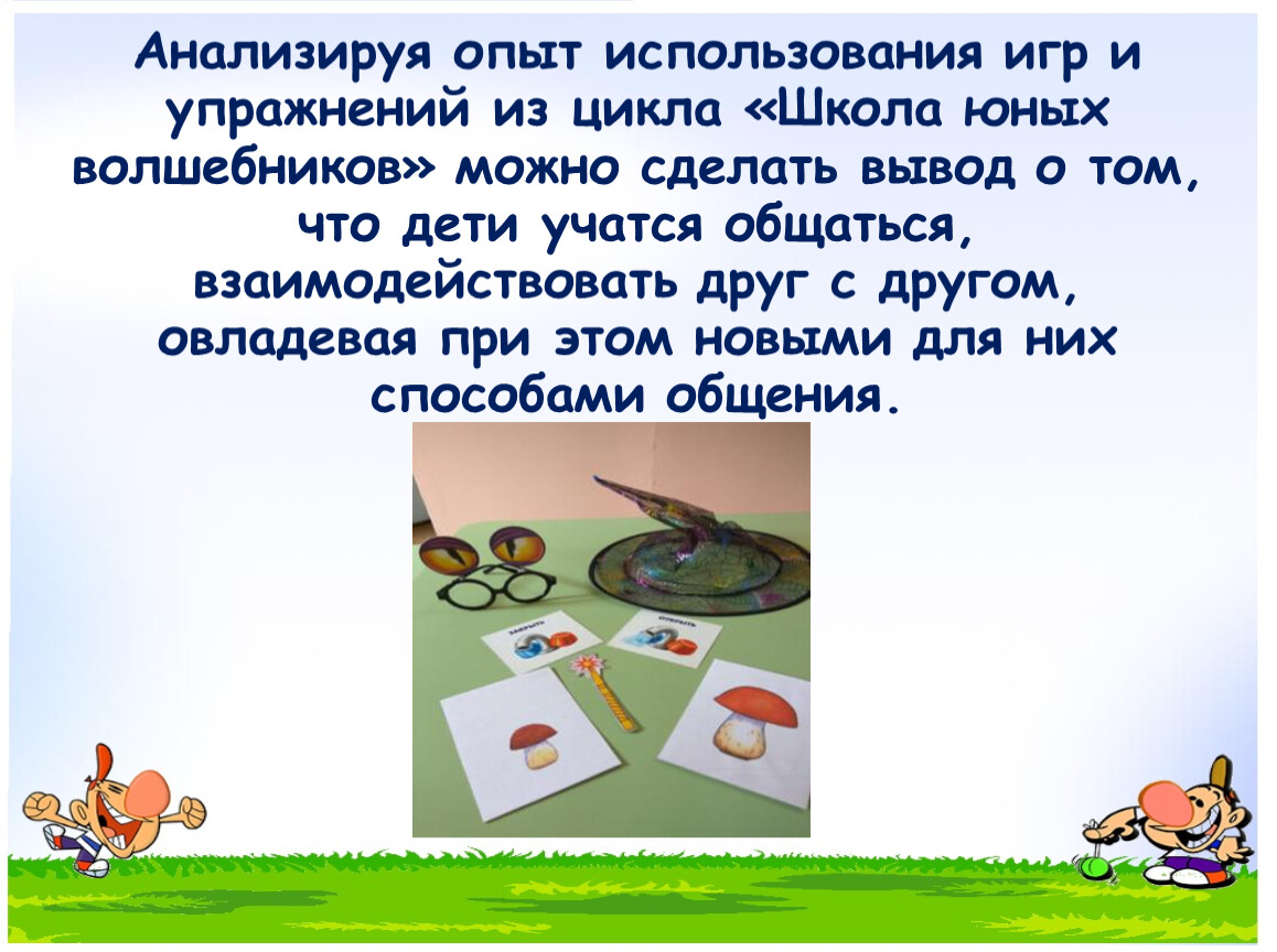 Анализируя опыт использования игр и упражнений из цикла «Школа юных волшебников» можно сделать вывод о том, что дети учатся общаться, взаимодействовать друг с другом, овладевая при этом новыми для них способами общения.