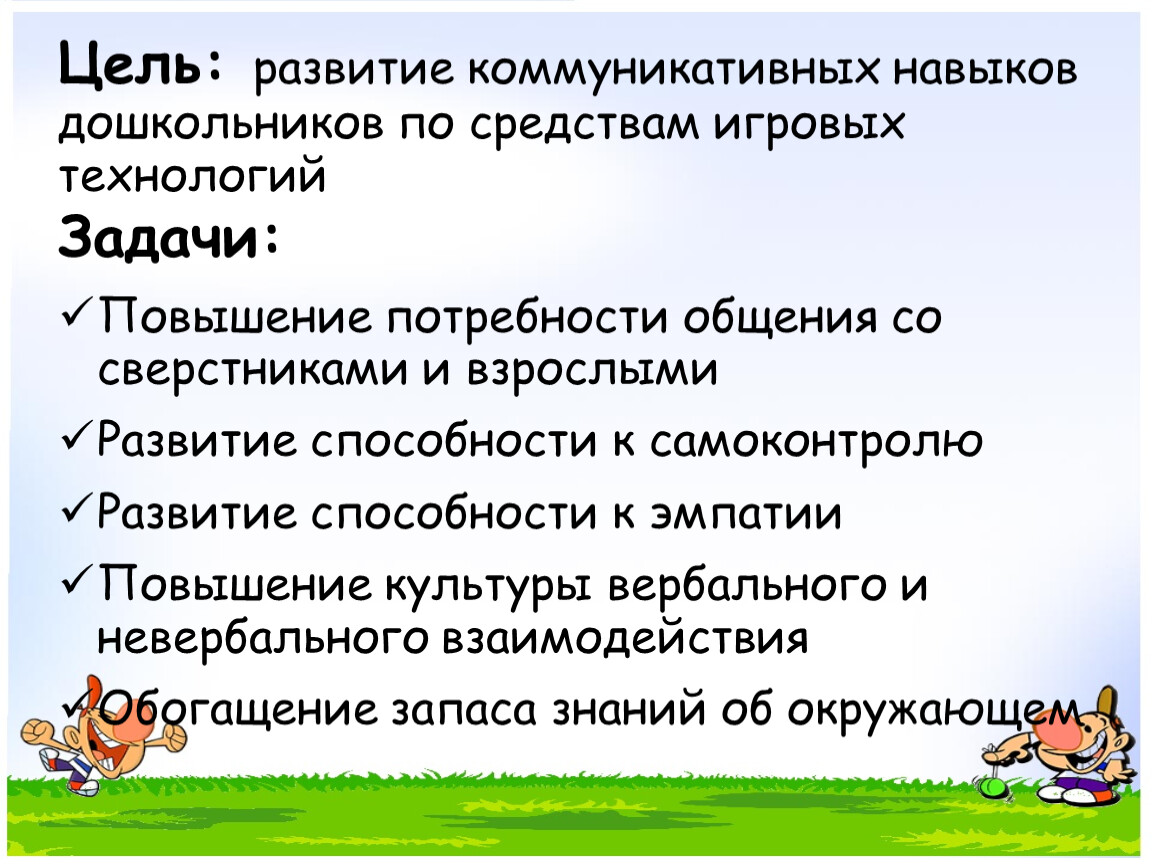 Цель: развитие коммуникативных навыков дошкольников по средствам игровых технологий