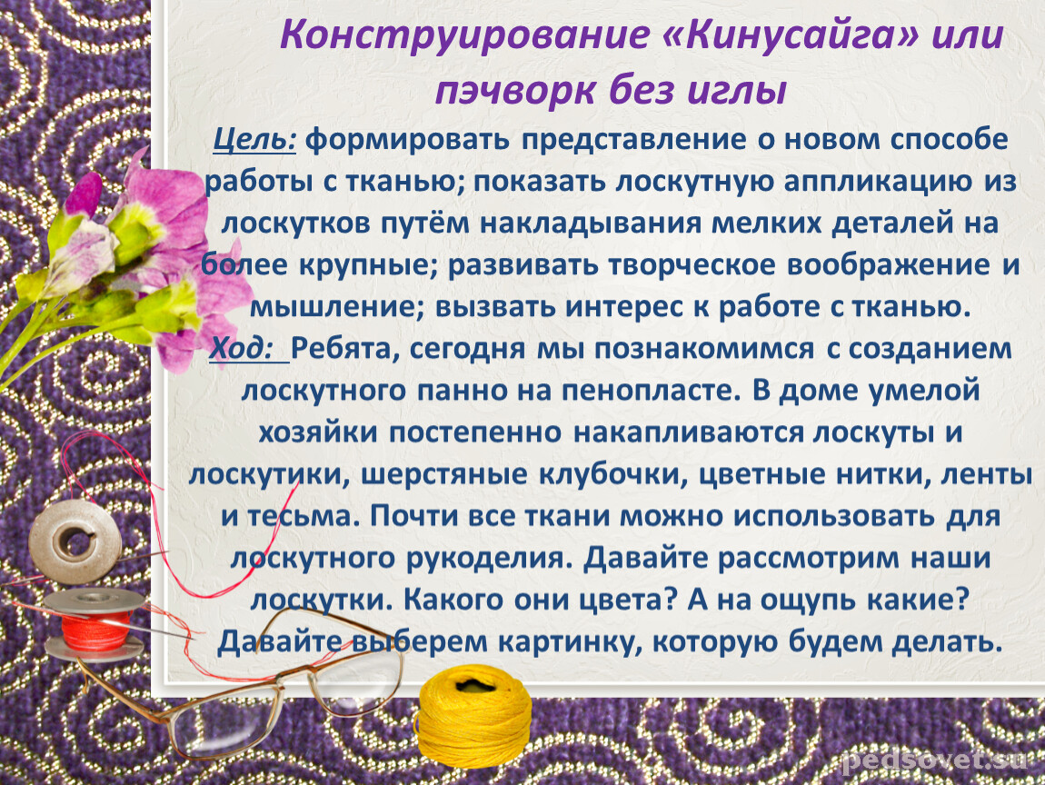 Конструирование «Кинусайга» или пэчворк без иглыЦель: формировать представление о новом способе работы с тканью; показать лоскутную аппликацию из лоскутков путём накладывания мелких деталей на более крупные; развивать творческое воображение и мышление; вызвать интерес к работе с тканью.Ход: Ребята, сегодня мы познакомимся с созданием лоскутного панно на пенопласте. В доме умелой хозяйки постепенно накапливаются лоскуты и лоскутики, шерстяные клубочки, цветные нитки, ленты и тесьма. Почти все ткани можно использовать для лоскутного рукоделия. Давайте рассмотрим наши лоскутки. Какого они цвета? А на ощупь какие? Давайте выберем картинку, которую будем делать.
