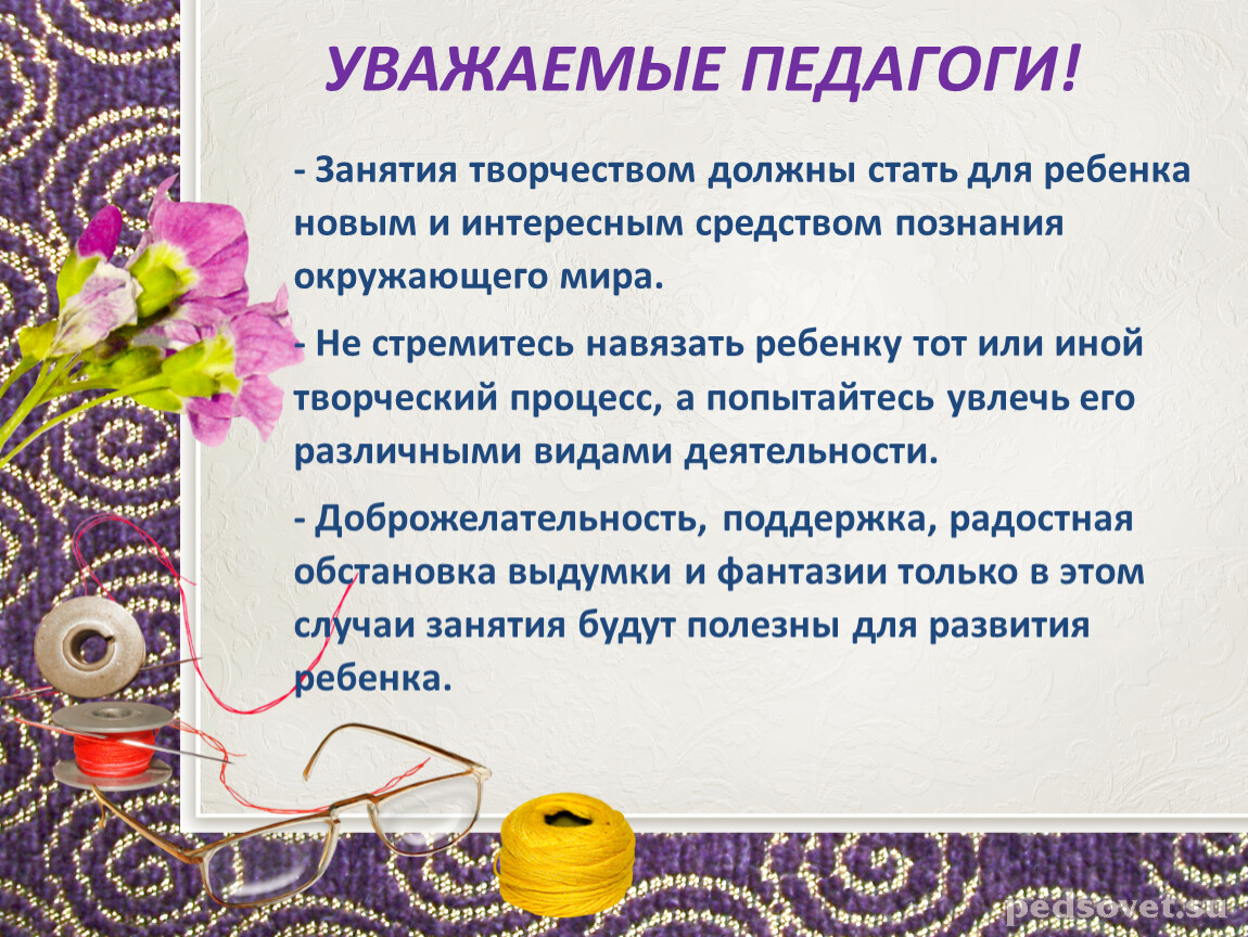 - Занятия творчеством должны стать для ребенка новым и интересным средством познания окружающего мира.
