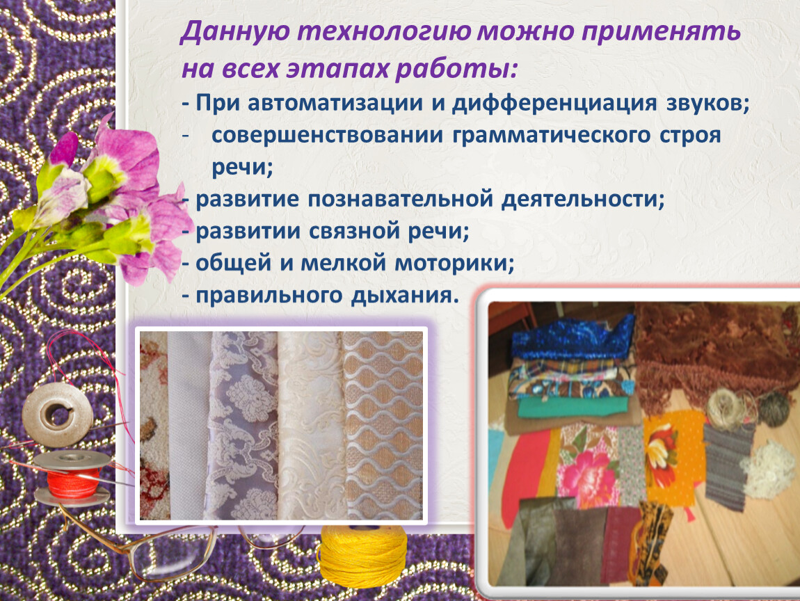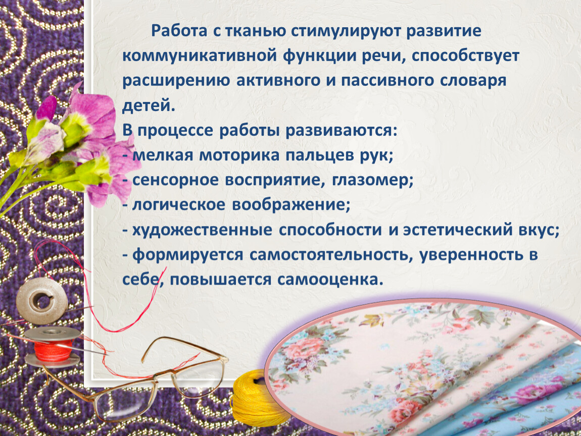 Работа с тканью стимулируют развитие коммуникативной функции речи, способствует расширению активного и пассивного словаря детей.