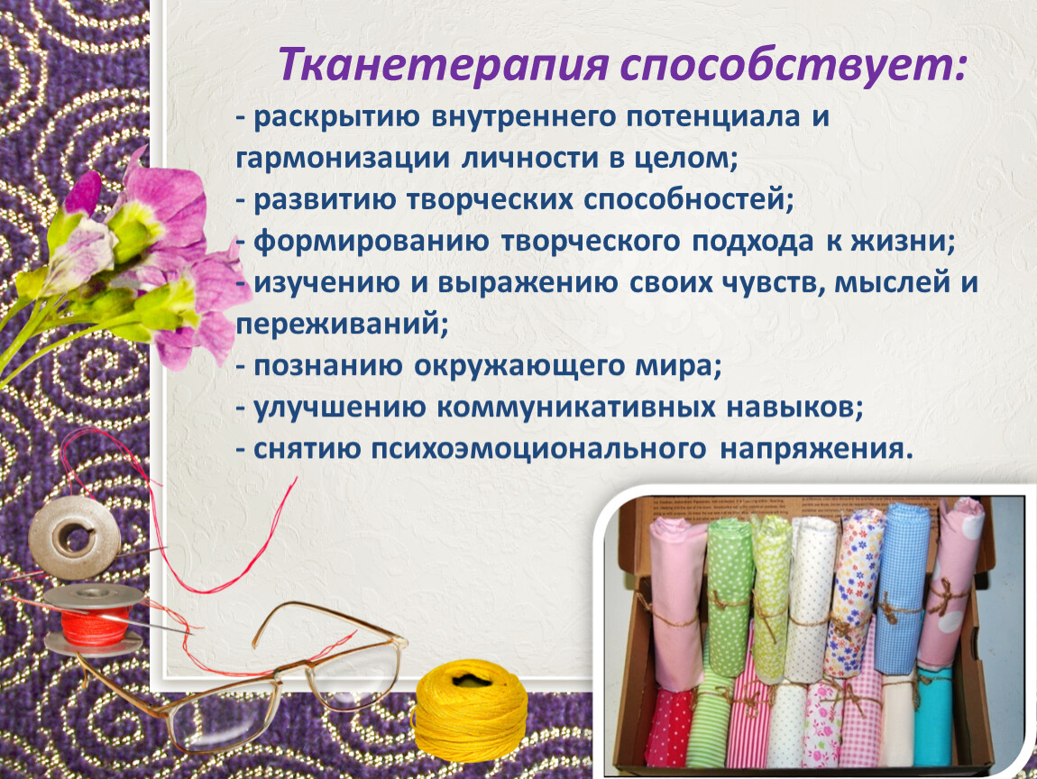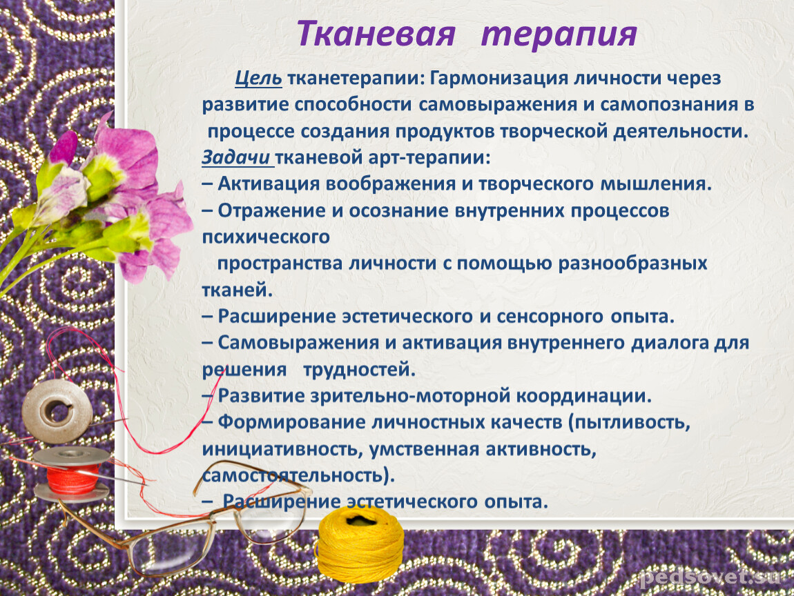 Цель тканетерапии: Гармонизация личности через развитие способности самовыражения и самопознания в процессе создания продуктов творческой деятельности.