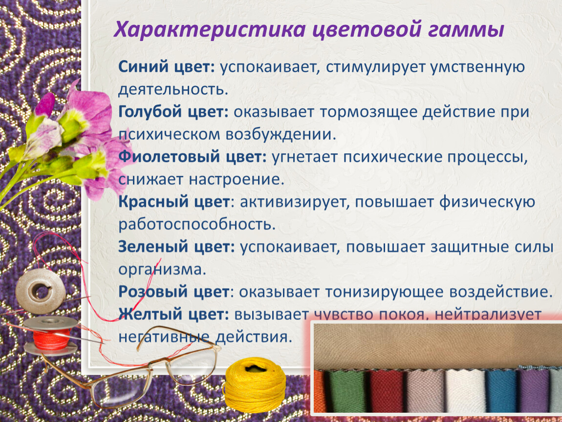 Голубой цвет: оказывает тормозящее действие при психическом возбуждении.