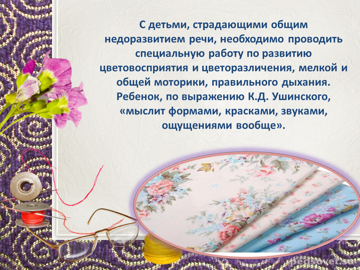 С детьми, страдающими общим недоразвитием речи, необходимо проводить специальную работу по развитию цветовосприятия и цветоразличения, мелкой и общей моторики, правильного дыхания. Ребенок, по выражению К.Д. Ушинского, «мыслит формами, красками, звуками, ощущениями вообще».
