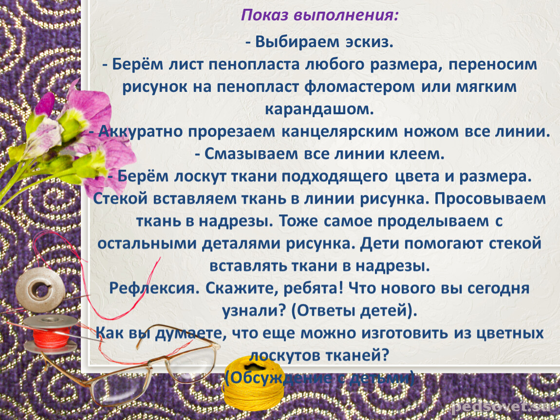 - Выбираем эскиз.- Берём лист пенопласта любого размера, переносим рисунок на пенопласт фломастером или мягким карандашом.- Аккуратно прорезаем канцелярским ножом все линии.- Смазываем все линии клеем.- Берём лоскут ткани подходящего цвета и размера. Стекой вставляем ткань в линии рисунка. Просовываем ткань в надрезы. Тоже самое проделываем с остальными деталями рисунка. Дети помогают стекой вставлять ткани в надрезы.Рефлексия. Скажите, ребята! Что нового вы сегодня узнали? (Ответы детей).Как вы думаете, что еще можно изготовить из цветных лоскутов тканей?(Обсуждение с детьми)