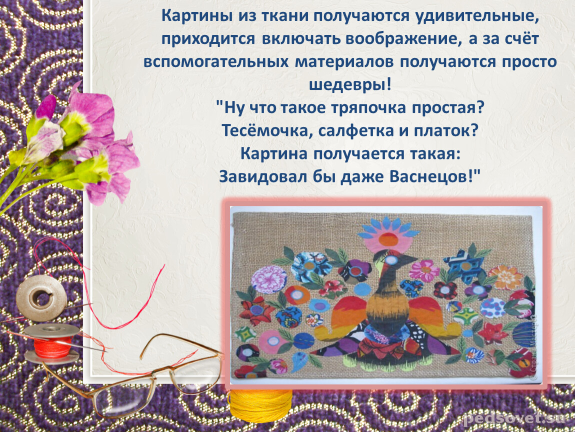 Картины из ткани получаются удивительные, приходится включать воображение, а за счёт вспомогательных материалов получаются просто шедевры!