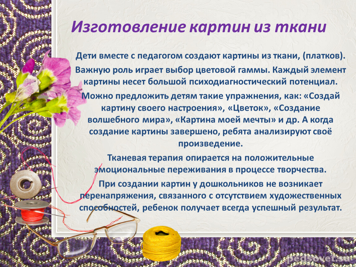 Тканевая терапия опирается на положительные эмоциональные переживания в процессе творчества.