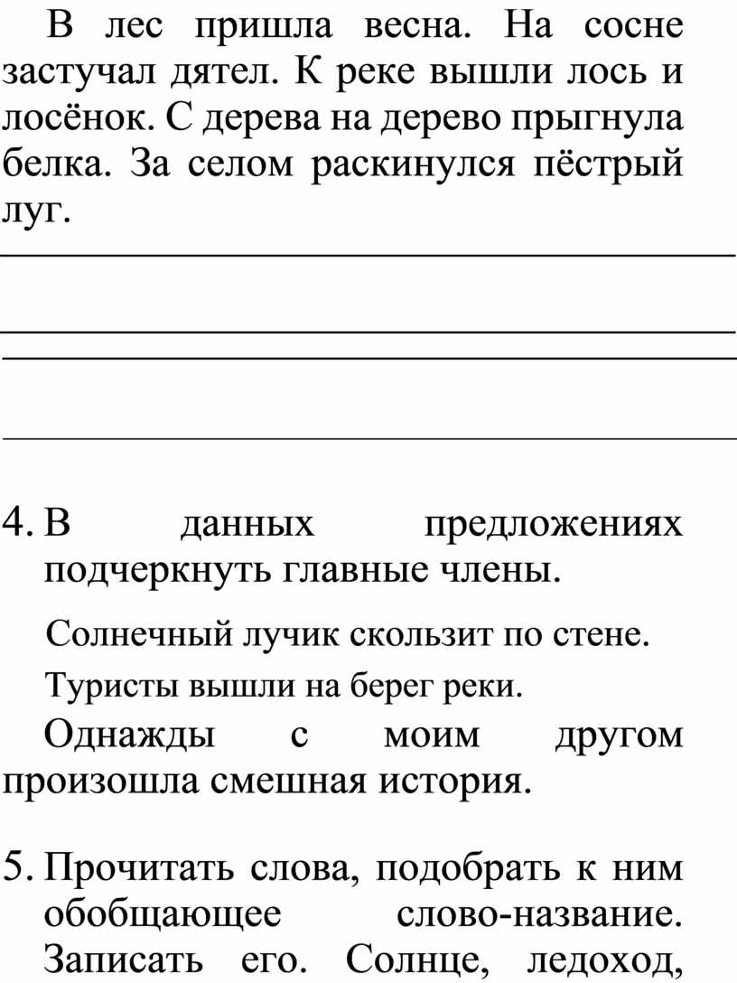 На реке треснул лёд. Над водой кружит чайка. Звонко стучат дятлы. Возле пенька присел заяц. Звери и птички рады весне и теплу. |