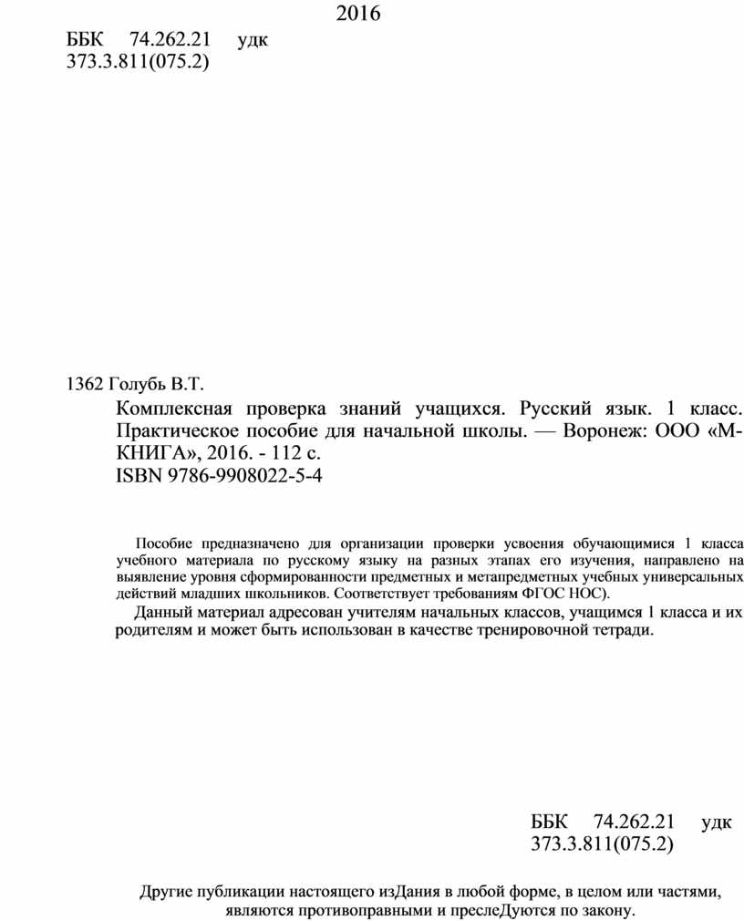 Комплексная проверка знаний учащихся. Русский язык. 1 класс. Практическое пособие для начальной школы. — Воронеж: ООО «М-КНИГА», 2016. - 112 с.