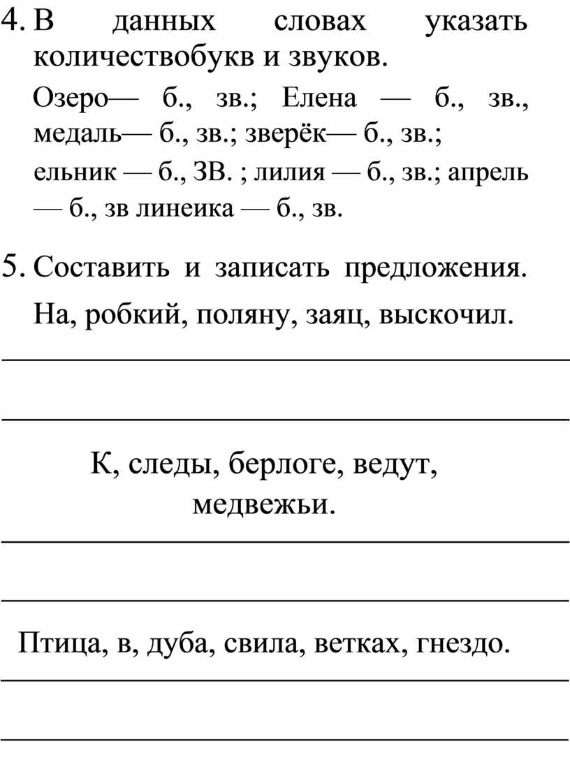 Язык — 4 б., 5 зв. каюта — 5 б., б зв. веселье — 7 б., 7 зв. улей — 4 б., 4 зв. деньки — б б., 5 зв. поляна — б б., 6 зв. конёк — 5 б., 5 зв. ельник — 6 б., 6 зв. |