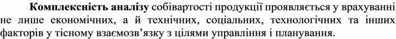 Комплексність аналізу собівартості продукції проявляється у врахуванні не лише економічних, а й технічних, соціальних, технологічних та інших факторів у тісному взаємозв’язку з цілями управління і планування.