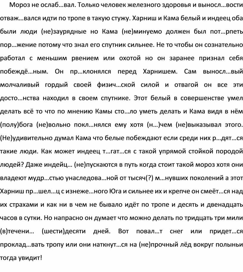 Мороз не ослаб…вал. Только человек железного здоровья и выносл…вости отваж…вался идти по тропе в такую стужу. Харниш и Кама белый и индеец оба были люди (не)заурядные но Кама (не)минуемо должен был пот…рпеть пор…жение потому что знал его спутник сильнее. Не то чтобы он сознательно работал с меньшим рвением или охотой но он заранее признал себя побеждё…ным. Он пр…клонялся перед Харнишем. Сам выносл…вый молчаливый гордый своей физич…ской силой и отвагой он все эти досто…нства находил в своем спутнике. Этот белый в совершенстве умел делать всё то что по мнению Камы сто…ло уметь делать и Кама видя в нём (полу)бога (не)вольно покл…нялся ему хотя (н…)чем (не)выказывал этого. (Не)удивительно думал Кама что белые побеждают если среди них р…дят…ся такие люди. Как может индеец т…гат…ся с такой упрямой стойкой породой людей? Даже индейц… (не)пускаются в путь когда стоит такой мороз хотя они владеют мудр…стью унаследова…ной от тысяч(?) м…нувших поколений а этот Харниш пр…шел…ц с изнеже…ного Юга и сильнее их и крепче он смеёт…ся над их страхами и как ни в чем не бывало идёт по тропе и десять и двенадцать часов в сутки. Но напрасно он думает что можно делать по тридцать три мили (в)течени… (шести)десяти дней. Вот повал…т снег или придет…ся проклад…вать тропу или они наткнут…ся на (не)прочный лёд вокруг полыньи тогда увидит!