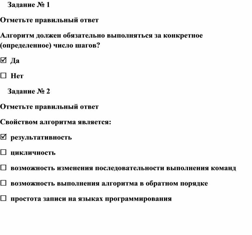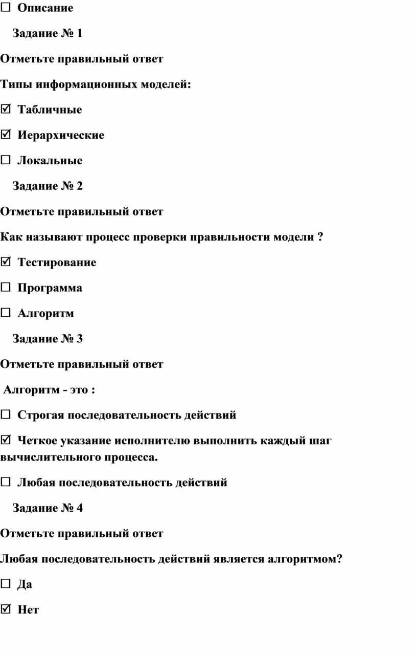 - правильность определения основных алгоритмических понятий (алгоритм, свойства алгоритма); - точность в определении основных алгоритмических конструкций; - правильность в способах записи алгоритмов |