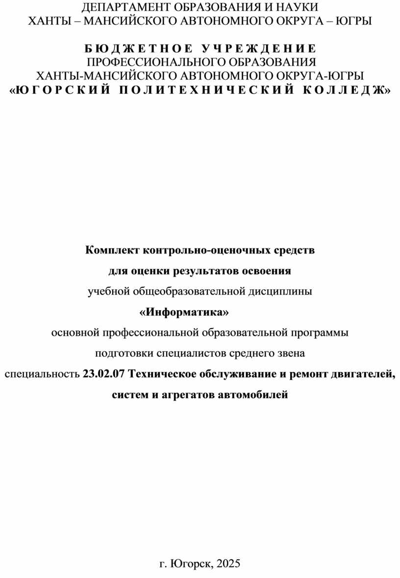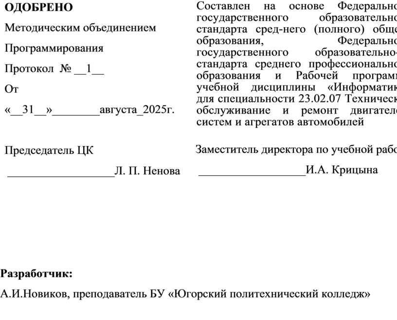 Составлен на основе Федерального государственного образовательного стандарта сред-него (полного) общего образования, Федерального государственного образовательно-го стандарта среднего профессионального образования и Рабочей программы учебной дисциплины «Информатика» для специальности 23.02.07 Техническое обслуживание и ремонт двигателей, систем и агрегатов автомобилей