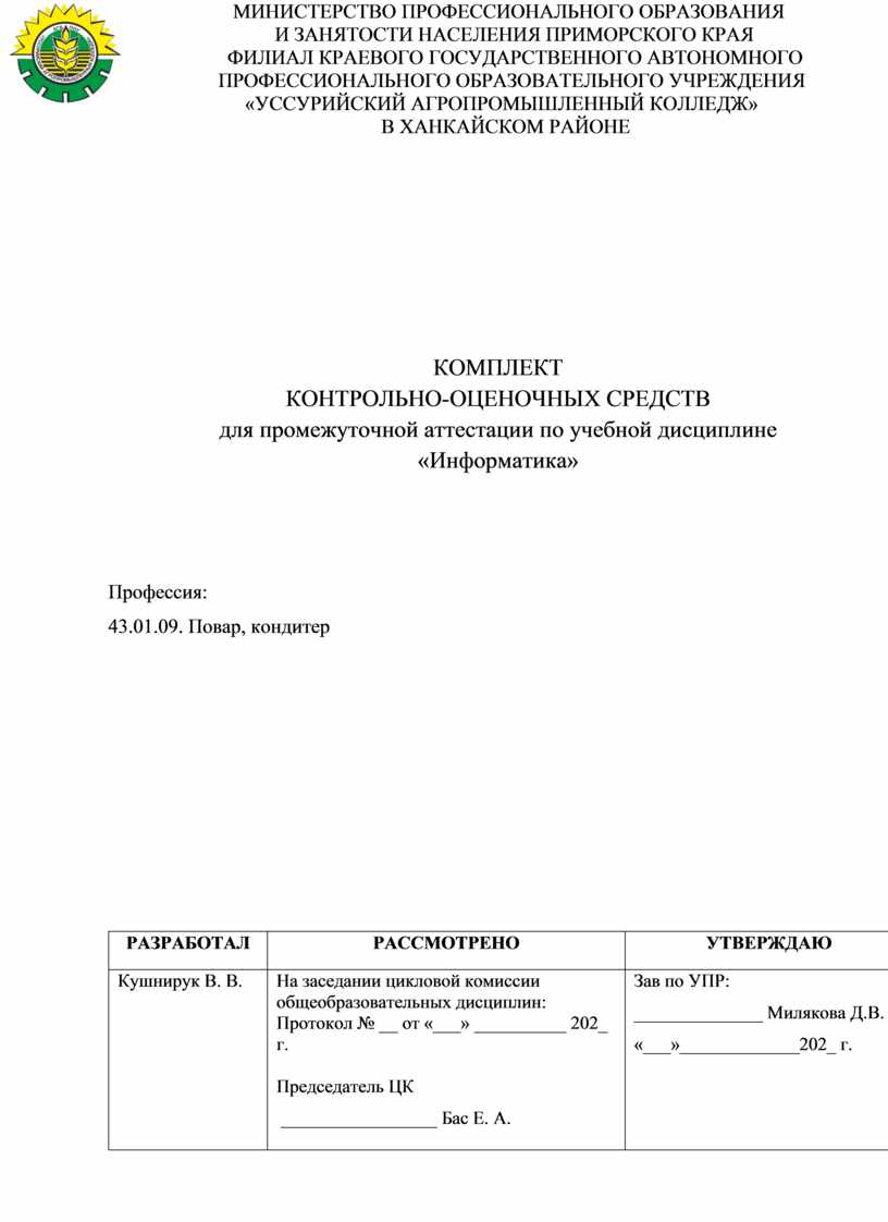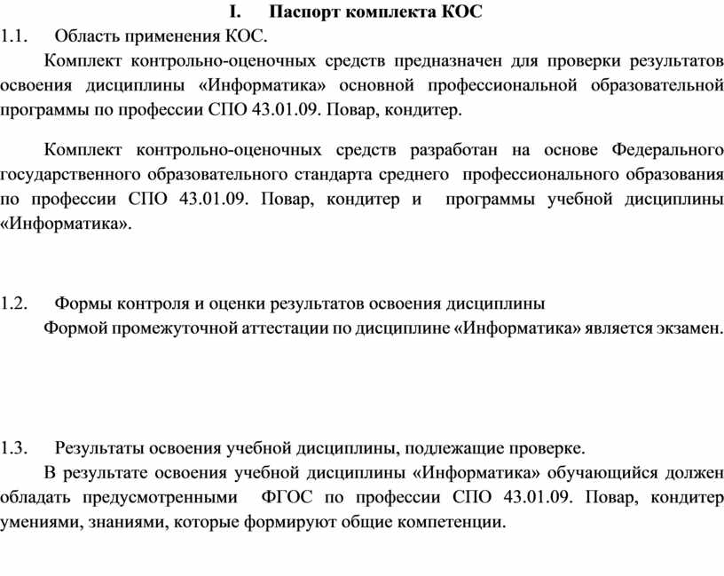 Комплект контрольно-оценочных средств разработан на основе Федерального государственного образовательного стандарта среднего профессионального образования по профессии СПО 43.01.09. Повар, кондитер и программы учебной дисциплины «Информатика».