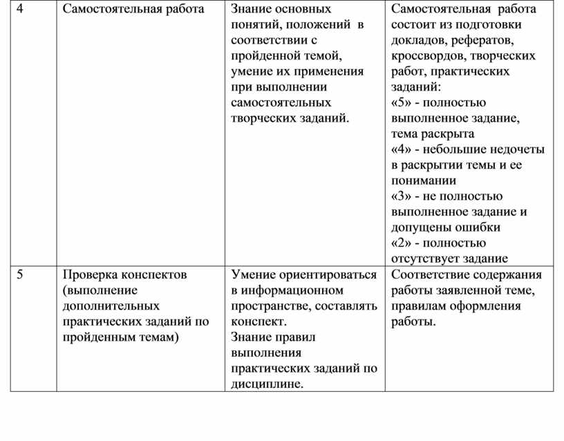Самостоятельная работа состоит из подготовки докладов, рефератов, кроссвордов, творческих работ, практических заданий: «5» - полностью выполненное задание, тема раскрыта «4» - небольшие недочеты в раскрытии темы и ее понимании «3» - не полностью выполненное задание и допущены ошибки «2» - полностью отсутствует задание |