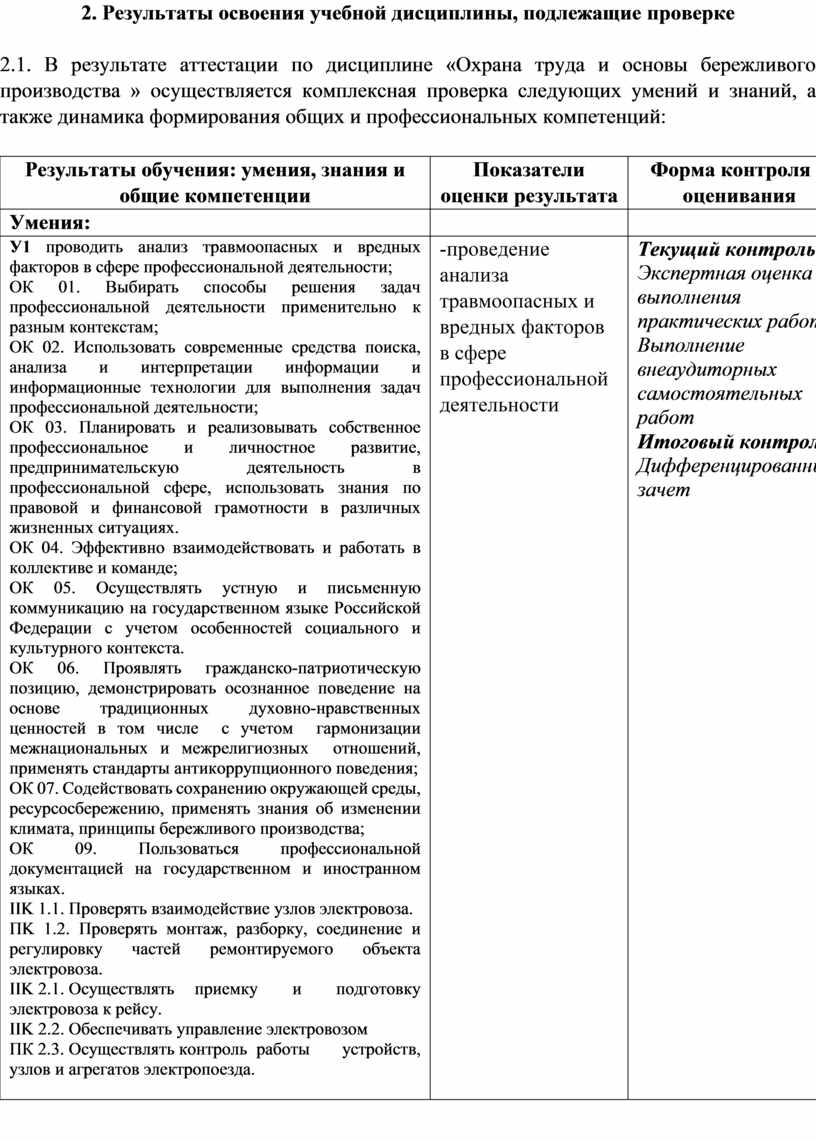 2.1. В результате аттестации по дисциплине «Охрана труда и основы бережливого производства » осуществляется комплексная проверка следующих умений и знаний, а также динамика формирования общих и профессиональных компетенций: