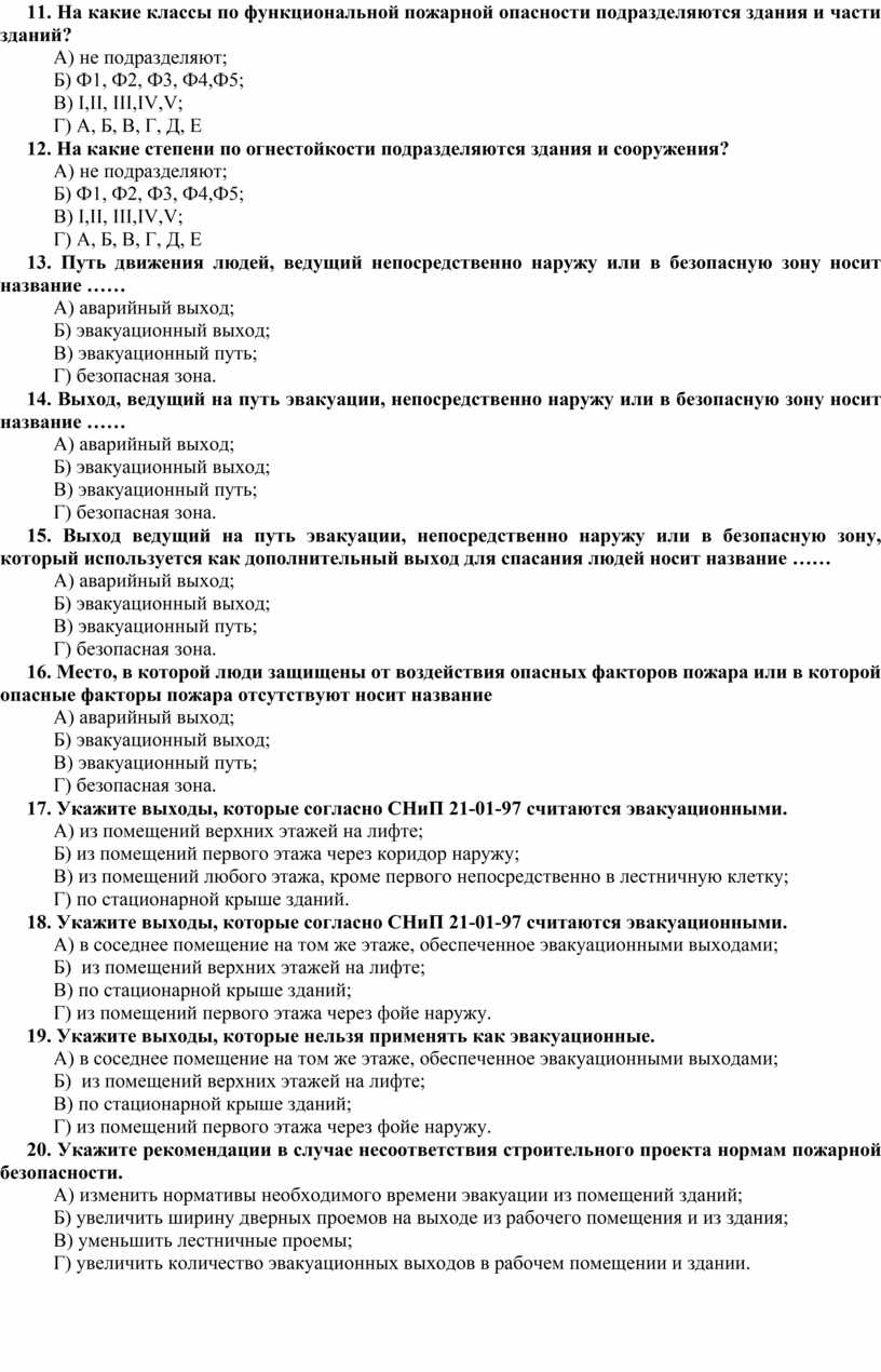11. На какие классы по функциональной пожарной опасности подразделяются здания и части зданий?