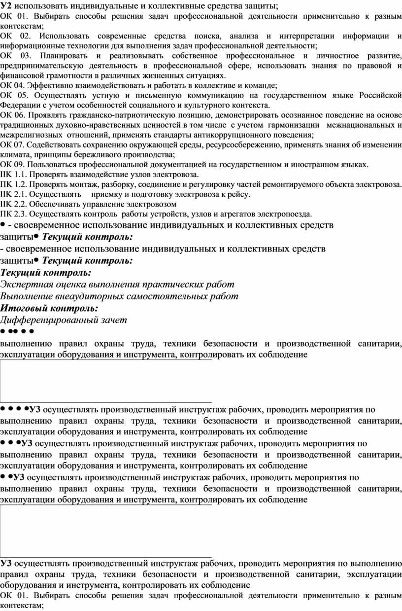 У2 использовать индивидуальные и коллективные средства защиты; ОК 01. Выбирать способы решения задач профессиональной деятельности применительно к разным контекстам; ОК 02. Использовать современные средства поиска, анализа и интерпретации информации и информационные технологии для выполнения задач профессиональной деятельности; ОК 03. Планировать и реализовывать собственное профессиональное и личностное развитие, предпринимательскую деятельность в профессиональной сфере, использовать знания по правовой и финансовой грамотности в различных жизненных ситуациях. ОК 04. Эффективно взаимодействовать и работать в коллективе и команде; ОК 05. Осуществлять устную и письменную коммуникацию на государственном языке Российской Федерации с учетом особенностей социального и культурного контекста. ОК 06. Проявлять гражданско-патриотическую позицию, демонстрировать осознанное поведение на основе традиционных духовно-нравственных ценностей в том числе с учетом гармонизации межнациональных и межрелигиозных отношений, применять стандарты антикоррупционного поведения; ОК 07. Содействовать сохранению окружающей среды, ресурсосбережению, применять знания об изменении климата, принципы бережливого производства; ОК 09. Пользоваться профессиональной документацией на государственном и иностранном языках. IIK 1.1. Проверять взаимодействие узлов электровоза. ПK 1.2. Проверять монтаж, разборку, соединение и регулировку частей ремонтируемого объекта электровоза. IIK 2.1. Осуществлять приемку и подготовку электровоза к рейсу. IIK 2.2. Обеспечивать управление электровозом ПК 2.3. Осуществлять контроль работы устройств, узлов и агрегатов электропоезда.