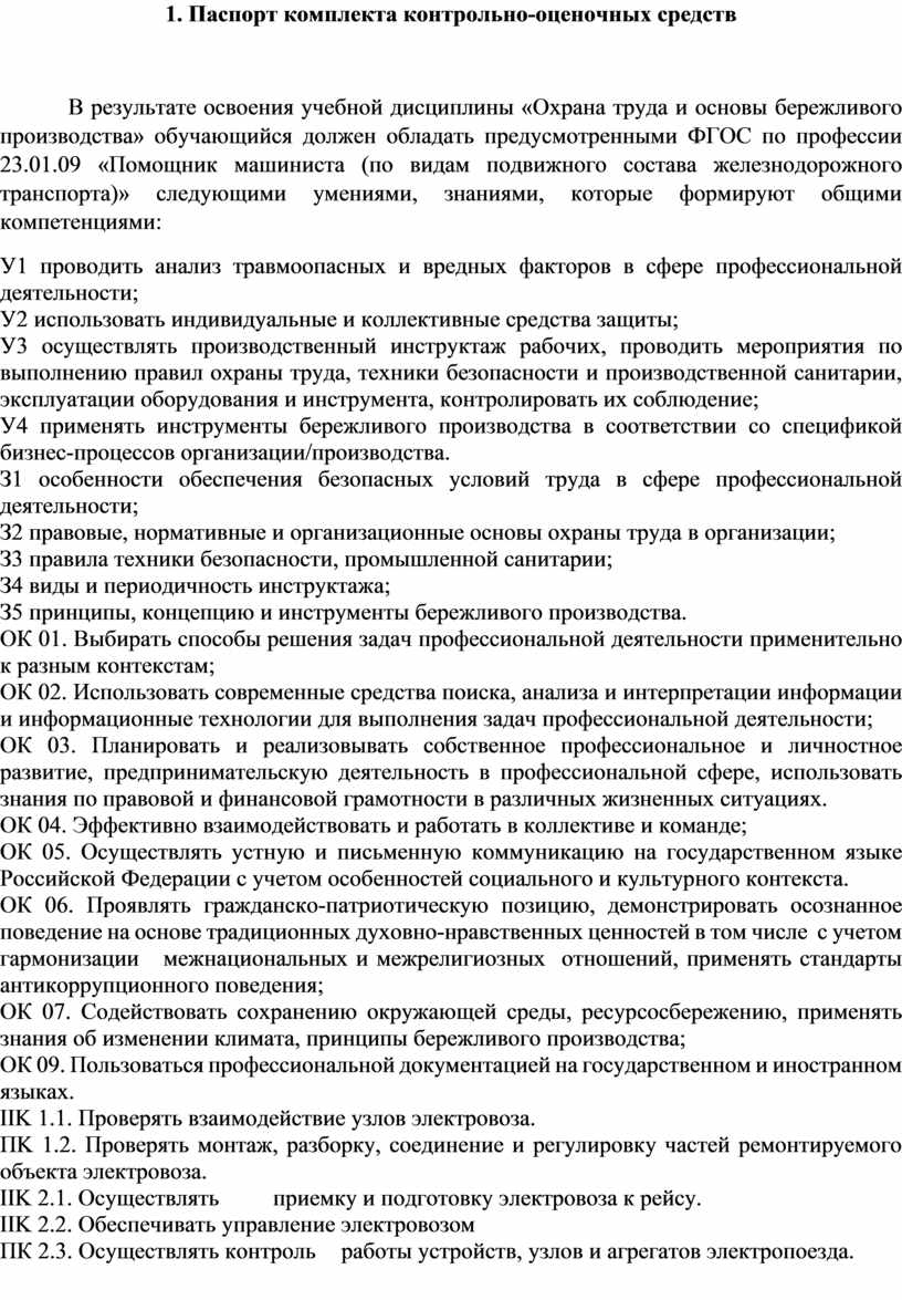 У1 проводить анализ травмоопасных и вредных факторов в сфере профессиональной деятельности; ОК 01. Выбирать способы решения задач профессиональной деятельности применительно к разным контекстам; ОК 02. Использовать современные средства поиска, анализа и интерпретации информации и информационные технологии для выполнения задач профессиональной деятельности; ОК 03. Планировать и реализовывать собственное профессиональное и личностное развитие, предпринимательскую деятельность в профессиональной сфере, использовать знания по правовой и финансовой грамотности в различных жизненных ситуациях. ОК 04. Эффективно взаимодействовать и работать в коллективе и команде; ОК 05. Осуществлять устную и письменную коммуникацию на государственном языке Российской Федерации с учетом особенностей социального и культурного контекста. ОК 06. Проявлять гражданско-патриотическую позицию, демонстрировать осознанное поведение на основе традиционных духовно-нравственных ценностей в том числе с учетом гармонизации межнациональных и межрелигиозных отношений, применять стандарты антикоррупционного поведения; ОК 07. Содействовать сохранению окружающей среды, ресурсосбережению, применять знания об изменении климата, принципы бережливого производства; ОК 09. Пользоваться профессиональной документацией на государственном и иностранном языках. IIK 1.1. Проверять взаимодействие узлов электровоза. ПK 1.2. Проверять монтаж, разборку, соединение и регулировку частей ремонтируемого объекта электровоза. IIK 2.1. Осуществлять приемку и подготовку электровоза к рейсу. IIK 2.2. Обеспечивать управление электровозом ПК 2.3. Осуществлять контроль работы устройств, узлов и агрегатов электропоезда.