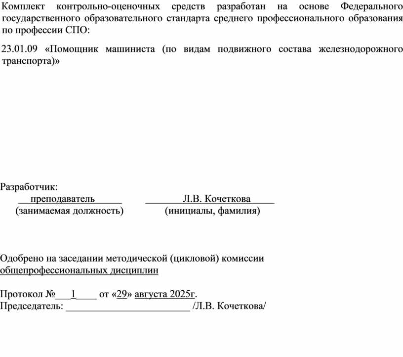 Комплект контрольно-оценочных средств разработан на основе Федерального государственного образовательного стандарта среднего профессионального образования по профессии СПО: