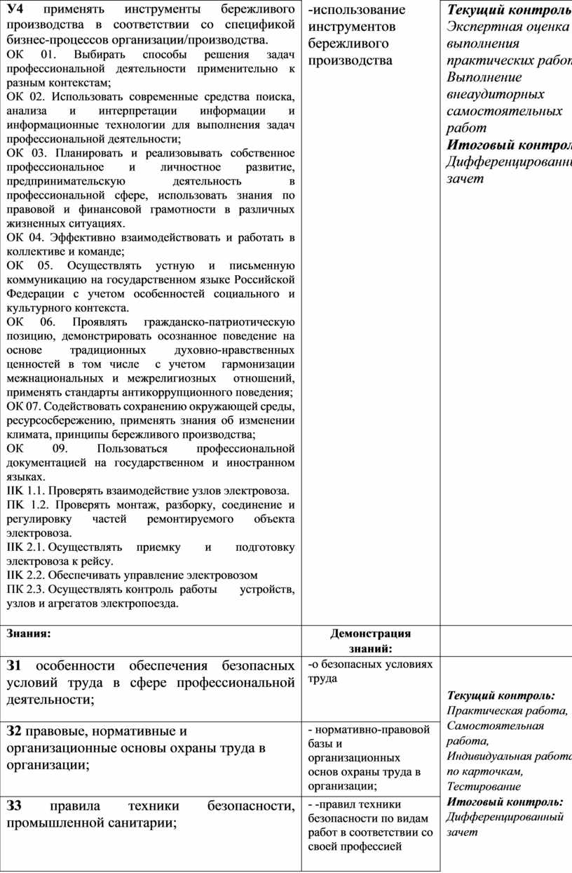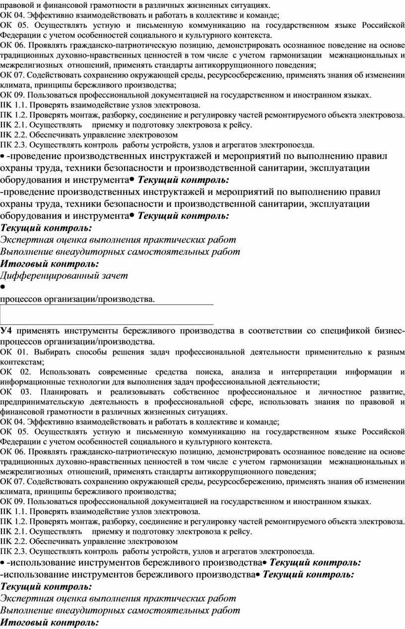 У4 применять инструменты бережливого производства в соответствии со спецификой бизнес-процессов организации/производства. ОК 01. Выбирать способы решения задач профессиональной деятельности применительно к разным контекстам; ОК 02. Использовать современные средства поиска, анализа и интерпретации информации и информационные технологии для выполнения задач профессиональной деятельности; ОК 03. Планировать и реализовывать собственное профессиональное и личностное развитие, предпринимательскую деятельность в профессиональной сфере, использовать знания по правовой и финансовой грамотности в различных жизненных ситуациях. ОК 04. Эффективно взаимодействовать и работать в коллективе и команде; ОК 05. Осуществлять устную и письменную коммуникацию на государственном языке Российской Федерации с учетом особенностей социального и культурного контекста. ОК 06. Проявлять гражданско-патриотическую позицию, демонстрировать осознанное поведение на основе традиционных духовно-нравственных ценностей в том числе с учетом гармонизации межнациональных и межрелигиозных отношений, применять стандарты антикоррупционного поведения; ОК 07. Содействовать сохранению окружающей среды, ресурсосбережению, применять знания об изменении климата, принципы бережливого производства; ОК 09. Пользоваться профессиональной документацией на государственном и иностранном языках. IIK 1.1. Проверять взаимодействие узлов электровоза. ПK 1.2. Проверять монтаж, разборку, соединение и регулировку частей ремонтируемого объекта электровоза. IIK 2.1. Осуществлять приемку и подготовку электровоза к рейсу. IIK 2.2. Обеспечивать управление электровозом ПК 2.3. Осуществлять контроль работы устройств, узлов и агрегатов электропоезда.
