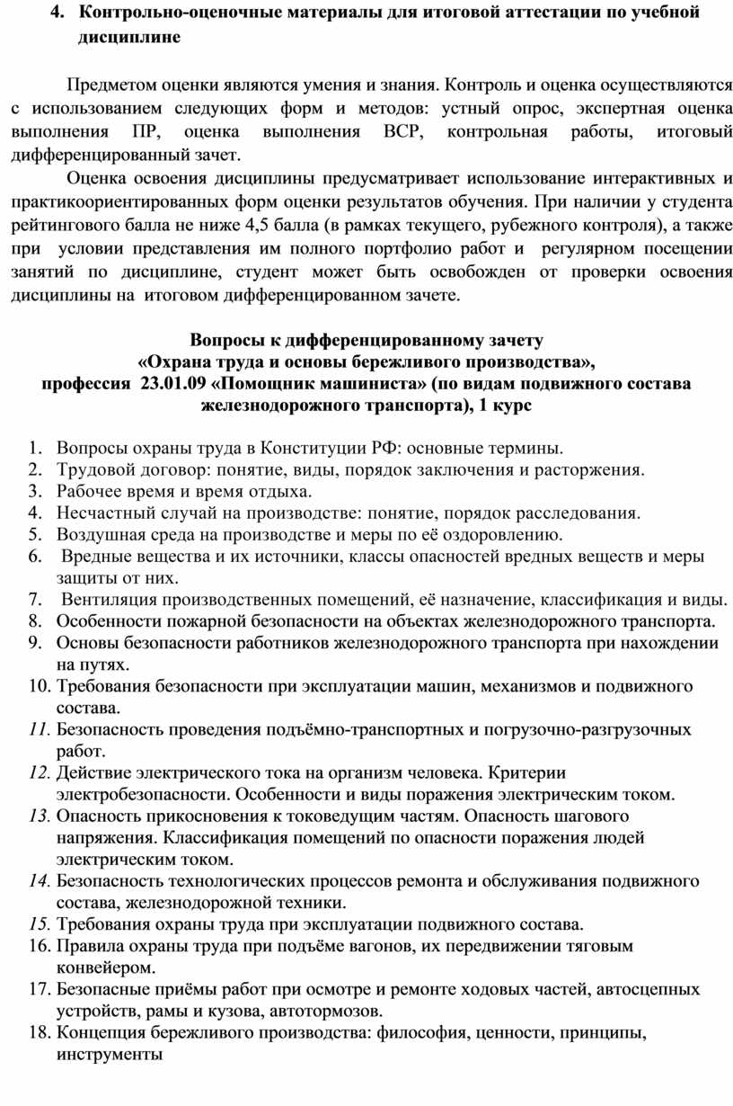 Предметом оценки служат умения и знания, предусмотренные ФГОС по дисциплине «Охрана труда и основы бережливого производства», направленные на формирование общих и профессиональных компетенций.