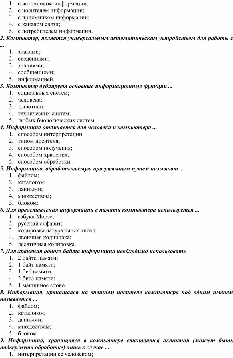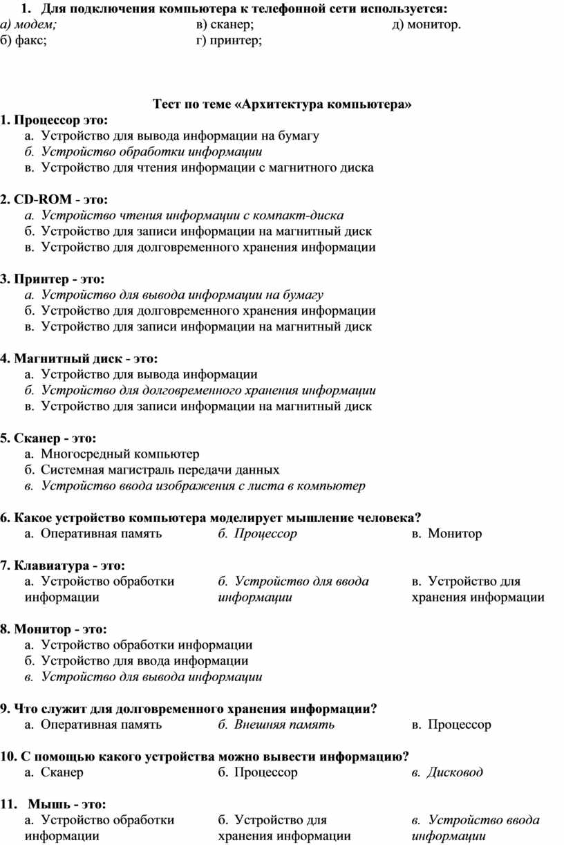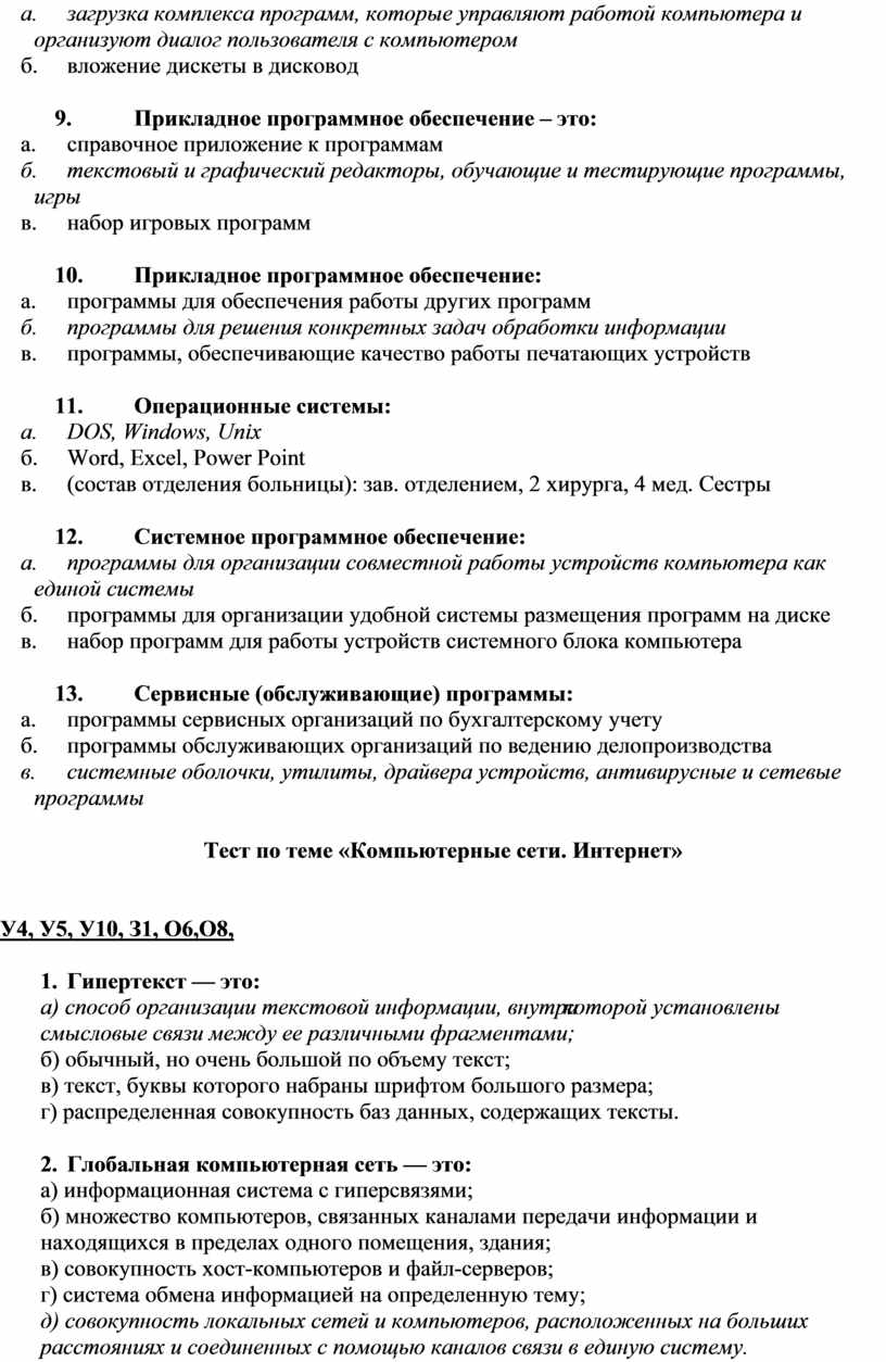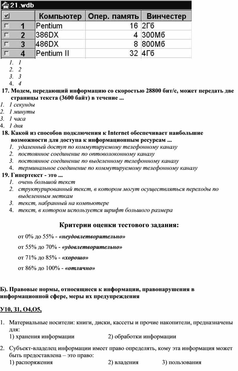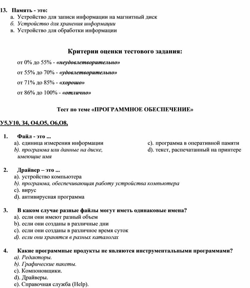 Оборудование: компьютер с установленным программным обеспечением (программа тестирования, пакет MS Office)