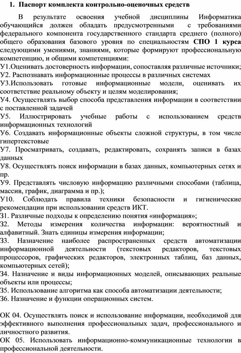 В результате освоения учебной дисциплины Информатика обучающийся должен обладать предусмотренными с требованиями федерального компонента государственного стандарта среднего (полного) общего образования базового уровня по специальностям СПО 1 курса следующими умениями, знаниями, которые формируют профессиональную компетенцию, и общими компетенциями: