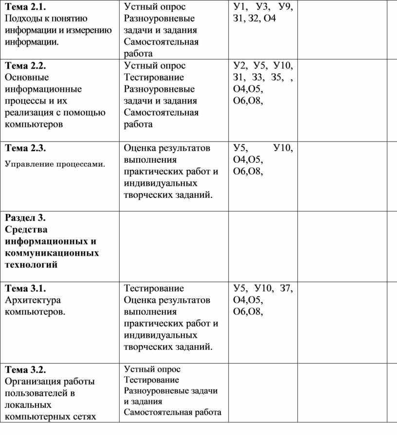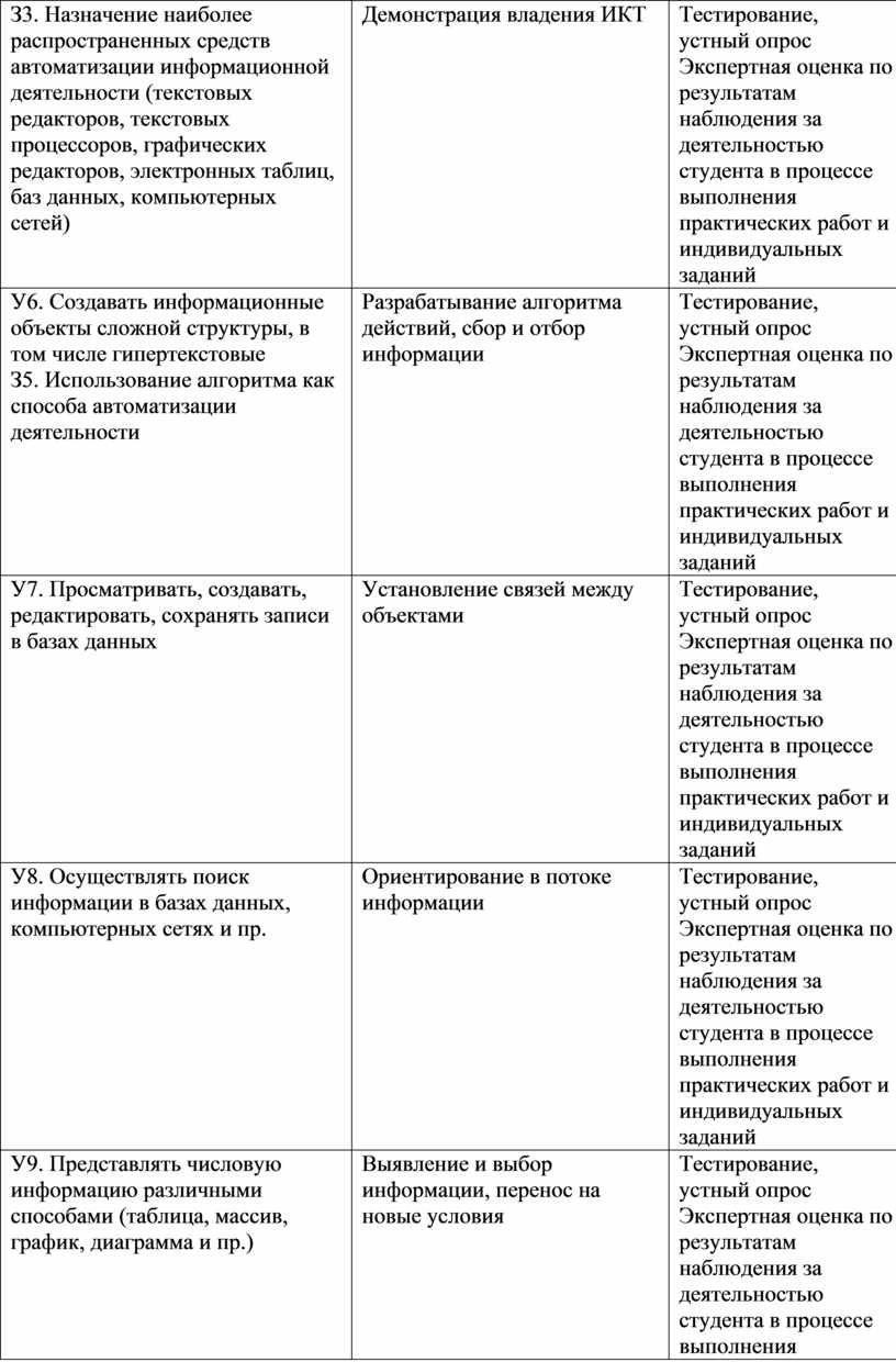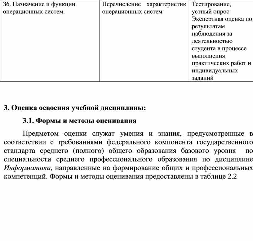 Предметом оценки служат умения и знания, предусмотренные в соответствии с требованиями федерального компонента государственного стандарта среднего (полного) общего образования базового уровня по специальности среднего профессионального образования по дисциплине Информатика, направленные на формирование общих и профессиональных компетенций. Формы и методы оценивания предоставлены в таблице 2.2