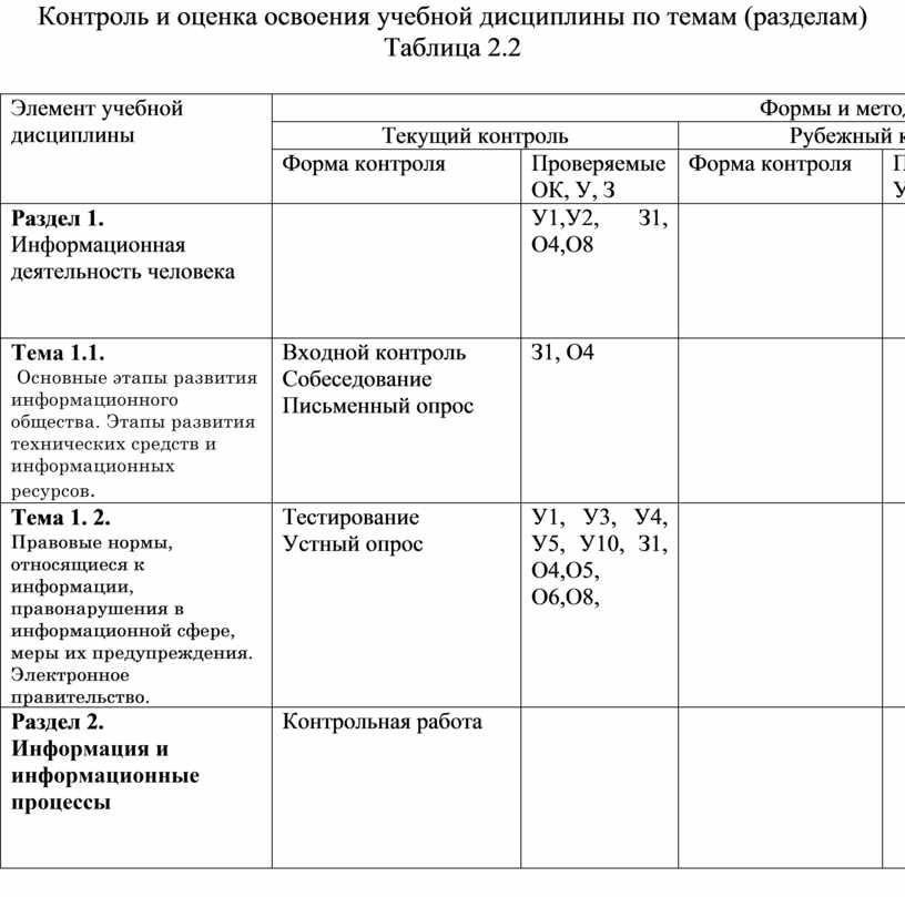 Контроль и оценка освоения учебной дисциплины по темам (разделам) Таблица 2.2